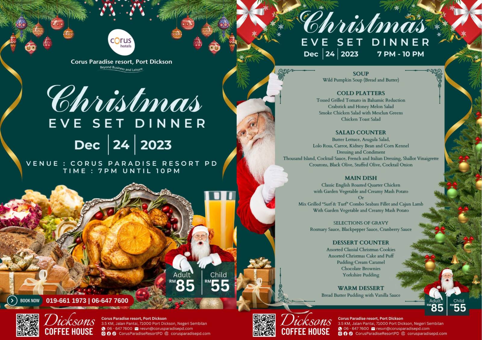 Join us for a delightful set dinner starting at 7 PM on December 24, 2023. Treat your taste buds to a magical evening for only RM85 per adult and RM55 per child.